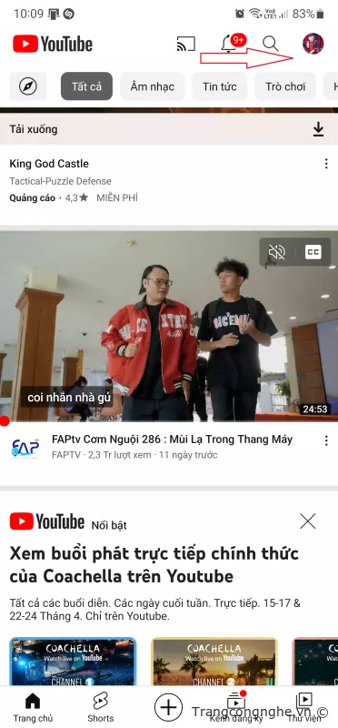 Bước 1: Mở ứng dụng YouTube. Trên giao diện chính, chọn biểu tượng tài khoản (avatar) ở góc phải màn hình.
