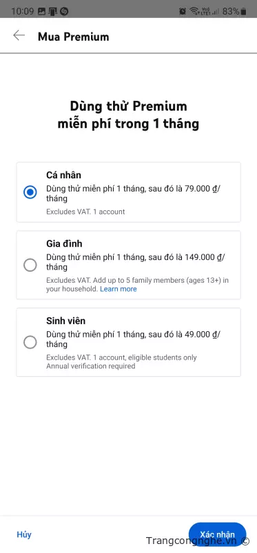 - Cá nhân: Dành cho một tài khoản sử dụng, giá 79.000 đồng/tháng.
