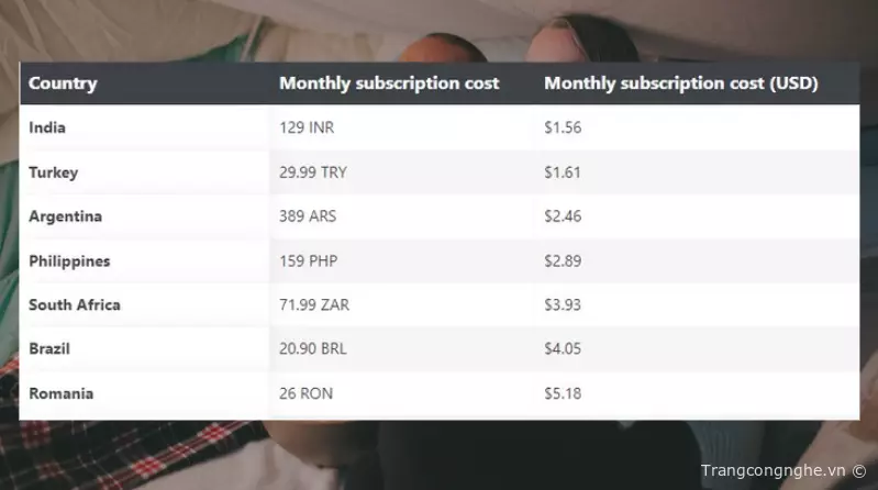 Để hiểu rõ hơn, chúng ta có thể so sánh mức giá của YouTube Premium tại Việt Nam với các quốc gia khác trên thế giới. Ấn Độ hiện đang là quốc gia có giá rẻ nhất với mức chi trả chỉ 1,56 USD/tháng cho gói thuê bao cá nhân. Thổ Nhĩ Kỳ đứng Top 2 chỉ với 1,61 USD/tháng. Tiếp theo là, Argentina và Philippines lần lượt vào Top 3 và 4 với giá bán lần lượt là 2,46 và 2,89 USD/tháng. Ngoài ra, Nam Phi đang đứng ở vị trí Top 6 với chi phí là 3,93 USD/tháng.