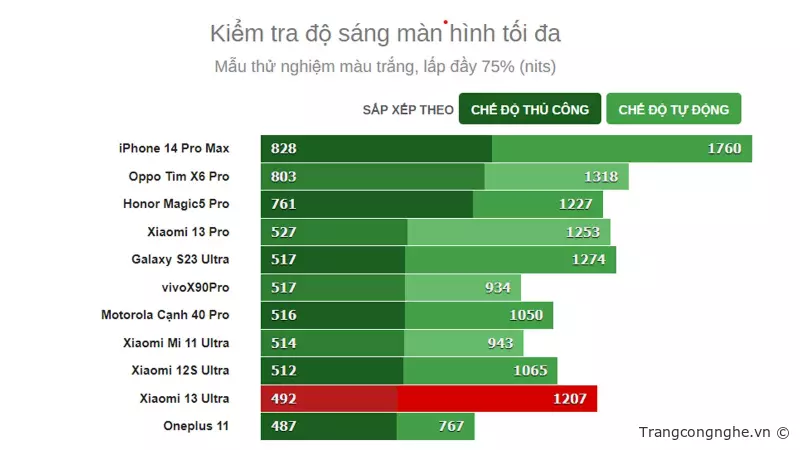 Như vậy, rõ ràng độ sáng của Xiaomi 13 Ultra đang tỏ ra thua thiệt hơn đáng kể so với các đối thủ khác. Dù đã được hãng quảng cáo là máy được trang bị tấm nền Huaxing C7 mới để tăng trải nghiệm người dùng, tuy nhiên, điều này vô tình khiến độ sáng màn hình của máy còn thấp hơn so với Xiaomi 13 Pro. Trong khi đó, OPPO Find X6 Pro hay iPhone 14 Pro Max đều sử dụng tấm nền Samsung E6. Do vậy, hiệu quả màn hình của 2 chiếc flagship này vẫn được đảm bảo.