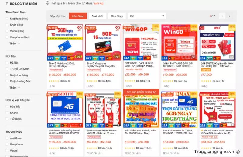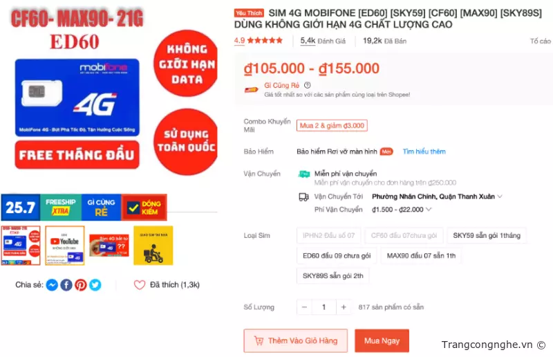 Khi tìm kiếm từ khoá 'sim 4G' trên Shopee và Lazada, người dùng sẽ thấy hàng chục nghìn kết quả trả về, với đa dạng mẫu mã và giá cả khác nhau. Đáng chú ý, vẫn xuất hiện các gói cước giá siêu rẻ, chỉ từ 150.000 – 200.000 đồng, mặc dù chúng thuộc các gói cước đã ngừng cấp. Tuy gói cước như ED60 của Mobifone đã ngừng triển khai đăng ký mới từ ngày 15/6 do không đạt mức giá đủ điều kiện, nhưng rất nhiều gian hàng trên Shopee vẫn tiếp tục bán SIM tích hợp sẵn gói cước này với giá chỉ 90.000 – 100.000 đồng.