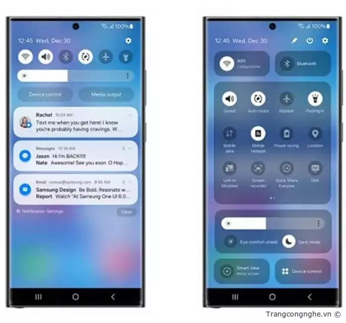 Trong One UI 6.0, Samsung đã tiết lộ một số thay đổi trực quan, đặc biệt là trong giao diện menu Cài đặt. Cụ thể, phần Wi-Fi và Bluetooth có diện tích lớn hơn, và thanh điều chỉnh độ sáng đã được bổ sung thêm hai tùy chọn ở phía dưới. Samsung cũng đã thay đổi cách sắp xếp các mục trong menu Cài đặt để tương tự với giao diện của iOS và ColorOS của OPPO. Ngoài ra, người dùng có thể truy cập nhanh vào toàn bộ menu Cài đặt chỉ bằng một lần vuốt, thay vì phải vuốt hai lần như trước đây.