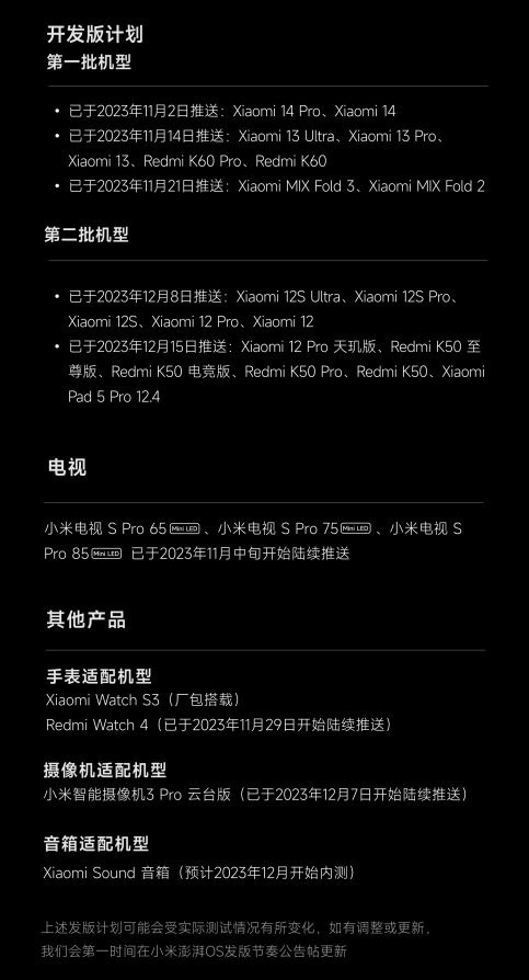 Theo thông báo của Xiaomi, việc triển khai lần này sẽ kéo dài từ tháng 1 đến giữa năm 2024. Danh sách của Xiaomi bao gồm: