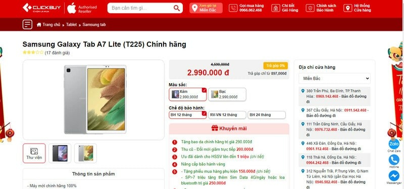 Clickbuy là địa chỉ bán Samsung Galaxy Tab A7 Lite (T 225) chính hãng với giá tốt nhất hiện nay. Chỉ cần chi phí của bạn khoảng 2.990.000 vnđ là đã có thể mua mẫu máy này. Bao gồm toàn bộ phụ kiện tặng kèm theo máy như là dây cáp, que chọc, bút, sách hướng dẫn. Khách hàng có thể lựa chọn 2 phiên bản màu cơ bản nhất là Grey và Silver.