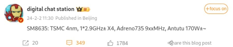 DCS cũng cho biết thêm rằng SM8635 có số điểm AnTuTu khoảng 1,7 triệu. Hiện không rõ tên chính thức của SM8635 là gì và khi nào ra mắt, nhưng nó có thể nằm giữa Snapdragon 8 Gen 2 là Gen 3 nên tạm thời gọi là Snapdragon 8s Gen 2 hoặc Snapdragon 8 Gen 3 Lite.