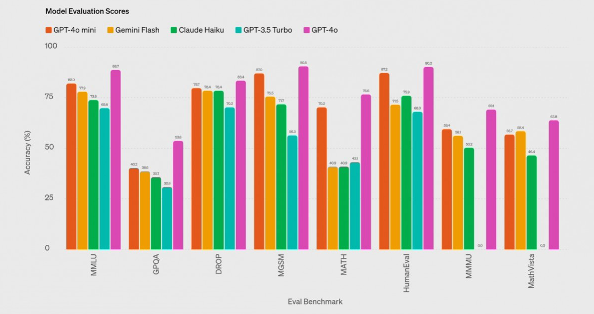 Theo thông báo từ OpenAI, GPT-4o mini mạnh mẽ hơn nhiều so với các model AI nhỏ gọn khác như Gemini Flash, Claude Haiku và GPT-3.5 Turbo. Nó vượt trội hơn tất cả các model kia trong các bài kiểm tra và khả năng xử lý vấn đề gần tương đương với GPT-4o.