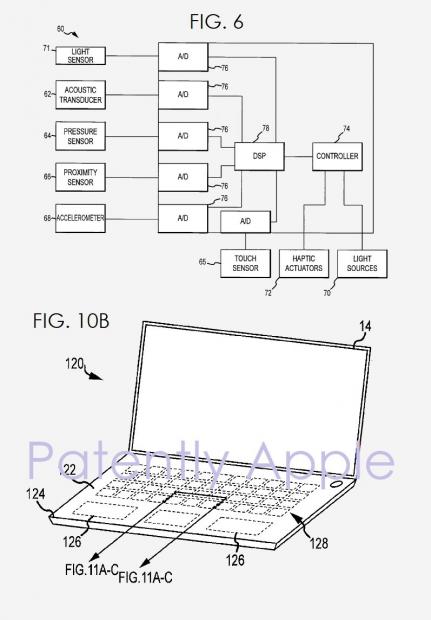 Trong hình mô tả số 6, Apple mô tả về một hệ thống sử dụng các cảm biến ánh sáng và cảm biến rung để tạo ra một loại bàn phím ảo hoặc các thiết lập theo tình huống (giống Touch Bar hiện tại) hỗ trợ khi chúng ta chơi game, chơi nhạc … Hình số 10B thì cho thấy thiết kế của một thiết bị giống laptop (MacBook) sở hữu bàn phím ảo có thể thay đổi các nút chức năng theo tình huống.