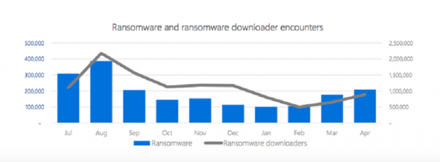 Ngoài ra Microsoft cũng đã công bố biểu đồ số liệu số lượng máy tính chạy hệ điều hành Windows dính mã độc ransomware. Hãng cũng cho biết hầu hết số lượng máy trong biểu đồ, phần lớn đang chạy hệ điều hành Windows 7 và Windows 2008 Server. Và chưa có một thiết bị nào đang chạy Windows 10 bị các mẫu virus ransomware xâm nhập (điển hình gần đây nhất là WannaCry).