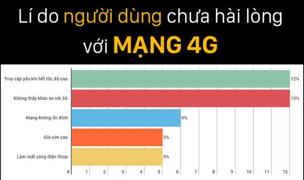 Đối với 735 người không hài lòng về mạng 4G. 12% trên tổng số cho rằng khi hết dung lượng tốc độ cao, truy cập bị yếu là điều làm họ không thích. Bên cạnh đó, có khoảng 12% người dùng trong 735 người không cảm thấy sự khác biệt giữa 4G và 3G khi trải nghiệm thực tế.