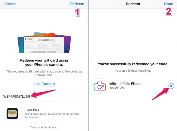 Khi chuyển sang AppStore bạn cần nhập lại mật khẩu iTunes Store để xác nhận thông tin và giao diện tự động chuyển tới trang nhận Gift Card kèm mã redeem miễn phí phía dưới. Nhấn vào nút Redeem ở góc trên bên phải màn hình và ứng dụng Infltr - Infinite Filters sẽ tự động tải về miễn phí.