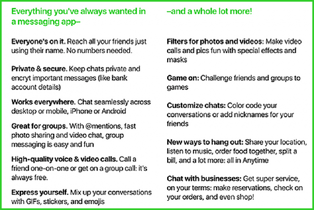Theo đó, Anytime sẽ có đủ chức năng để cạnh tranh với các mạng xã hội. Anytime sẽ có chat, chat voice, chat video, chia sẻ hình, filter cho hình/video, tính năng @Mention, Sticker, ảnh GIF động, chơi game, gọi (audio hoặc video) cho nhóm hoặc cá nhân. Toàn bộ nội dung của Anytime cũng sẽ được mã hóa. Anytime sẽ có phiên bản cho máy tính và các máy di động.
