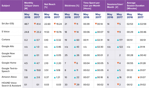 Một trong những đối thủ cạnh tranh lớn nhất của Cortana, Alexa của Amazon, cũng đang phát triển nhanh chóng. Số người dùng tăng 325% (chỉ tính cho người dùng duy nhất một tính năng trợ lý ảo) và mức độ giữ chân người dùng cũng tăng từ 10 lên 22%. Điều này làm cho cuộc chiến dành vị trí dẫn đầu trên thị trường vô cùng thú vị.