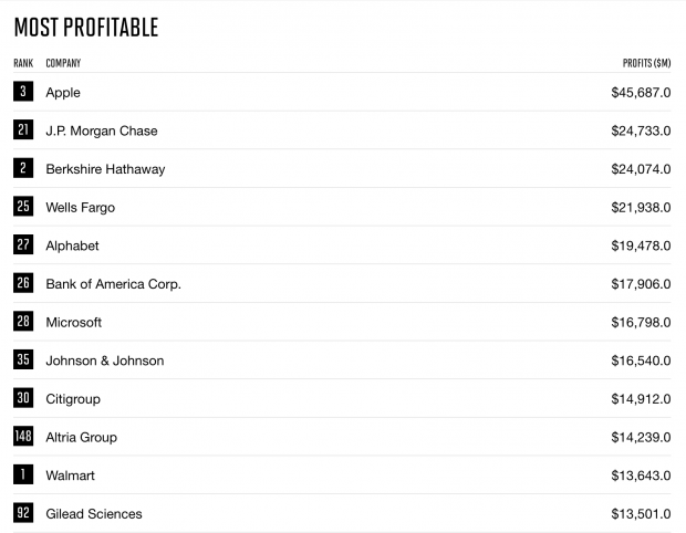 Tuy vậy, nếu xét về lợi nhuận thì nó lại là một câu chuyện khác hoàn toàn, Apple kiếm được 45.7 tỷ đô la Mỹ trong năm vừa qua, đứng thứ nhất trong khi Walmart là 13.6 tỷ đô la Mỹ, ở vị trí thứ 17.