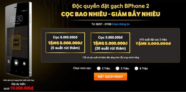 Mới đây, website của Thế Giới Di Động đã cho phép người dùng đặt trước mẫu BPhone 2 của Bkav với mức giá dự kiến 10.000.000 VNĐ với câu slogan 'Cọc bao nhiêu - trúng bấy nhiêu'.