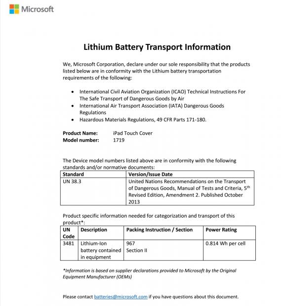 Theo một tài liệu an toàn vận chuyển được đệ trình lên Tổ chức hàng không dân dụng quốc tế (ICAO) thì Microsoft nhắc đến một chiếc bàn phím cảm ứng kiêm cover cho iPad, dùng pin Lithium-Ion, mang mã model 1719.