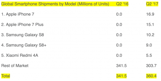 Báo cáo mới nhất từ công ty nghiên cứu thị trường Strategy Analytics cho thấy iPhone 7 và iPhone 7 Plus là hai smartphone bán chạy nhất thế giới trong Q2/2017. Samsung Galaxy S8 trong khi đó là chiếc điện thoại thông minh Android bán chạy nhất. Có tổng cộng 19 triệu chiếc S8 và S8 Plus đã được bán ra trên toàn cầu.