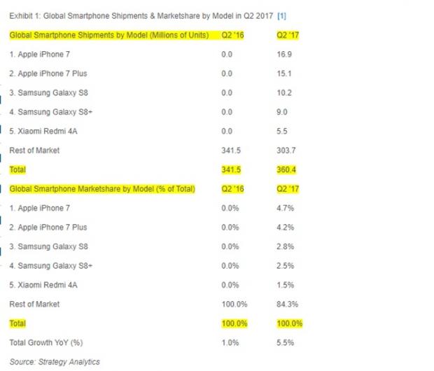 Theo dữ liệu mới của Strategy Analytics, iPhone 7 của Apple là smartphone phổ biến nhất trên thế giới trong Quý 2/2017, theo sau cũng là một thiết bị khác của Apple – iPhone 7 Plus. Apple đã bán ra được 16,9 triệu chiếc iPhone 7 4.7 inch và 15,1 triệu chiếc iPhone 7 Plus trong khoảng thời gian này. Hai thiết bị cầm tay này lần lượt chiếm 4,7% và 4,2% thị trường điện thoại thông minh toàn cầu.