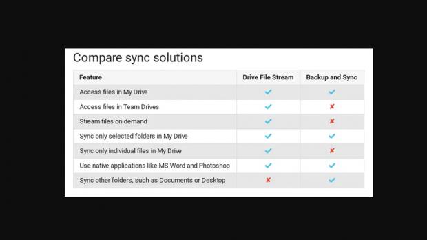 Có một số khác biệt giữa hai ứng dụng này, một số tính năng có thể làm việc trên ứng dụng này nhưng không làm việc được trên ứng dụng kia. Nên tốt nhất bạn hãy truy cập trang trợ giúp của Google (Google’s help pages) để kiểm tra xem có phù hợp với nhu cầu của mình hay không. Đối với hầu hết người dùng cá nhân thì công vụ Google’s Backup and Sync khá là hữu ích, tuy nhiên có thể nó sẽ không hỗ trợ cho các ổ đĩa NAS. Bạn có thể xem bảng so sánh các tính năng giữa hai công cụ dưới đây: