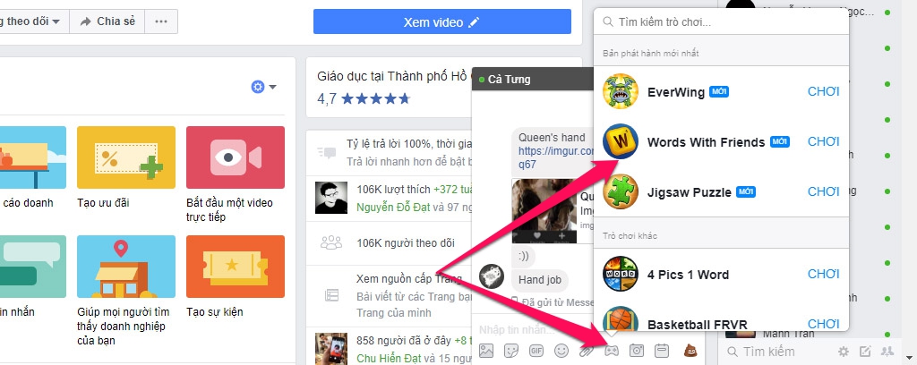 Trên trình duyệt web: Mở cuộc trò chuyện bất kỳ (hoặc người muốn chơi cùng) > nhấn vào biểu tượng gamepad > chọn game muốn chơi.