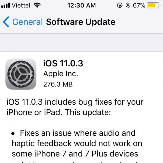 Apple cũng cho biết iOS 11.0.3 sẽ giải quyết tình trạng không phải hồi trên máy iPhone 6s khi sử dụng màn hình không chính hãng. Bản vá lỗi lần này có dung lượng khoảng 200 MB, người dùng được khuyến cáo sử dụng kết nối Wi-Fi để tải và cài đặt về máy. Thiết bị muốn cập nhật đang chạy iOS bản chính thức và có dung lượng pin từ 50% trở lên hoặc đang kết nối vào nguồn sạc.