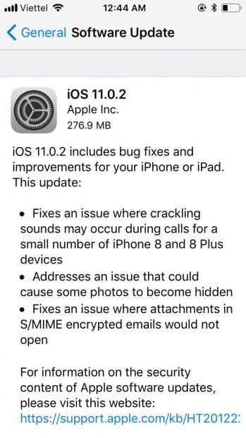 Bản iOS 11.0.2 cũng đã xác định được lỗi khiến một số hình ảnh trên máy bị ẩn đi, đồng thời xử lý sự cố các tệp đính kèm trong các email được mã hóa S/MIME không thể mở được.