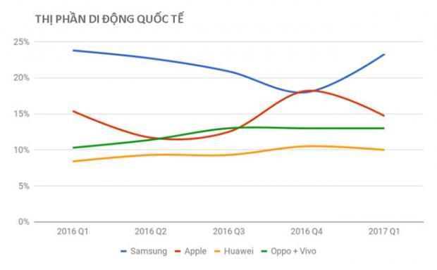 Trên thị trường quốc tế, Garter công bố Oppo bán được 30,9 triệu smartphone trong quý I/2017. Vivo bán 25,8 triệu máy, tổng cộng là 56,7 triệu. Trong khi đó, Samsung bán được 78,6 triệu smartphone còn Apple là 51,9 triệu cùng thời điểm.