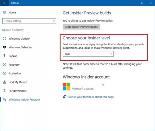 Settings > Update & security > Windows Insider Program > Tại mục Insider Level chọn Fast.