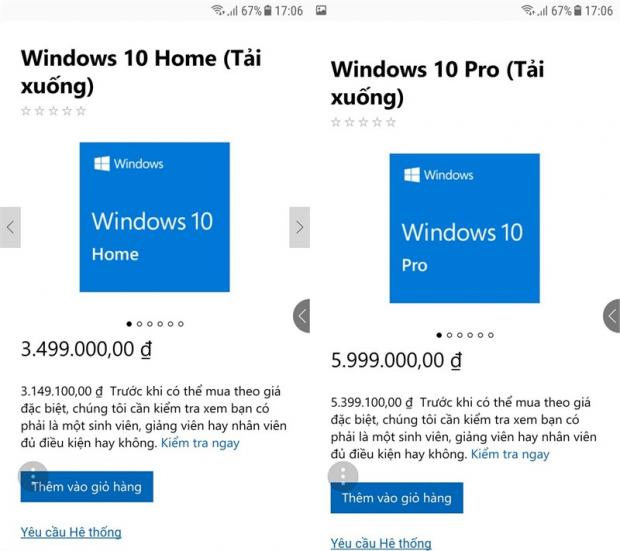 Giá bán các phiên bản Windows 10 trên trang sản phẩm của Microsoft