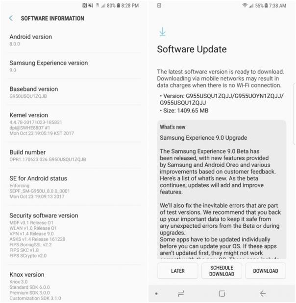 Như ảnh chụp màn hình phía trên cho thấy, trong bản cập nhật mới này Galaxy S8 và S8 Plus được đổi mới giao diện lên phiên bản Samsung Experience 9.0.