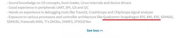 Một thông tin khác từ LikeIn đề cập đến tên các con chip Snapdragon 855, 840 và 830 cùng một vài con chip tầm trung khác đã được tung ra thị trường. Snapdragon 830 dường như đã không được mang đến thị trường như dự đoán, còn 840 thì xuất hiện trên Geekbench vào hồi tháng 7 vừa qua và có thể được sử dụng cho một thiết bị của Samsung.