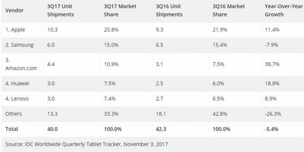 Theo techradar, trong quý 3/2017, doanh số máy tính bảng trên toàn thế giới đạt 40 triệu chiếc, giảm so với 42 triệu chiếc của cùng thời điểm năm ngoái.