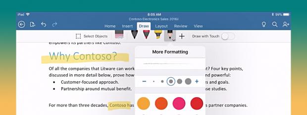 Đây là tin vui cho những anh em nào thích ghi chú bằng bút Apple Pencil nhưng lại cần sử dụng tài liệu định dạng Microsoft để dễ dàng chia sẻ với đồng nghiệp, thầy cô, bạn bè. Ví dụ, trong Word bạn có thể dùng bút để tô đậm những chỗ quan trọng, ghi chú lên file tài liệu được đối tác hay thầy cô phát cho, hoặc vẽ nhanh các đồi thị và ghi chú lên trang giấy. Bạn cũng có thể vẽ ra những hình ảnh trong PowerPoint để diễn tả ý tưởng của mình nhanh chóng hơn bao giờ hết. Tất nhiên người dùng hoàn toàn có thể chọn màu, chọn kích cỡ đầu bút như bao app hỗ trợ bút khác. Tất cả những thay đổi bạn đã thực hiện với bút sẽ được lưu vào file tài liệu, đảm bảo mở ở đâu, máy nào cũng đọc được.
