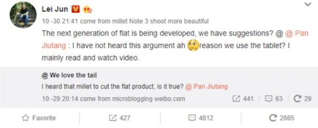 Thông qua tài khoản Weibo cá nhân, Lei Jun đã xác nhận, Xiaomi đang nghiên cứu mẫu Mi Pad 4, sản phẩm kế nhiệm Mi Pad 3 đã ra mắt vào hồi tháng 4/2017.