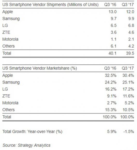 Nếu xét về thị phần, Apple vẫn giữ vị trí đầu tiên với 30.4% trong quý 3/2017 nhưng giảm 2.1% so với cùng kỳ năm ngoái. Trong khi đó các hãng smartphone chạy Android đều ghi nhận sự tăng trưởng thị phần, lần lượt là Samsung (25.1%), LG (17.2%), ZTE (11.6%) và cuối cùng là Motorola với 5.2% thị phần trong Q3/2017.