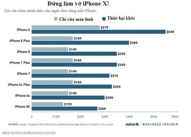 Thậm chí, hãng chuyên cung cấp bảo hiểm cho smartphone SquareTrade đã cảnh báo 'iPhone X là chiếc điện thoại dễ vỡ và đắt tiền nhất để sửa chữa của Apple'. Theo đó, chi phí để sửa màn hình của iPhone X đang là 279 USD (khoảng gần 6 triệu đồng), tức là đắt hơn bất cứ chiếc iPhone nào trước đó.