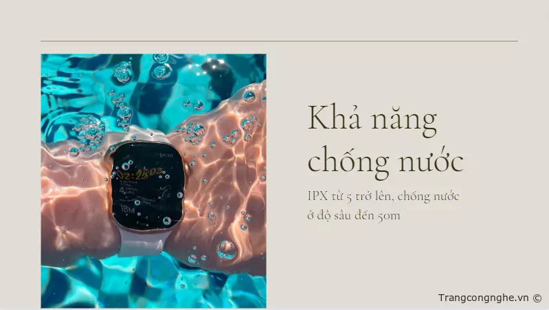 Đồng hồ thông minh đáng mua thì khả năng chống nước là một trong những tiêu chí quan trọng phải tìm hiểu kỹ. Đối với những người thường xuyên bơi lội, cần chọn đồng hồ có khả năng chống nước cao (IPX từ 5 trở lên, chống nước ở độ sâu đến 50m). Nếu chỉ cần tránh nước trong sinh hoạt hằng ngày thì có thể sử dụng sản phẩm có IPX4 trở xuống. Ngoài ra, nếu đi vào môi trường có nhiều bụi, nên chọn thêm đồng hồ có khả năng chống bụi.