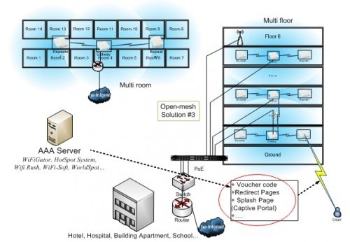 Giải pháp này sử dụng hoàn toàn các thiết bị Open-Mesh để triển khai dịch vụ Internet cơ bản cho người dùng. Các thiết bị Open-Mesh được quản lý và cấu hình đồng bộ thông qua một tài khoản trên Cloudtrax.com. Tài khoản này sẽ cấu hình chung cho toàn bộ các thiết bị Open-Mesh của khách hàng như SSID và mật khẩu truy cập AP (WPA, WPA2). Roaming của thiết bị Open-Mesh sẽ đáp ứng hoàn hảo cho những người sử dụng thường xuyên di chuyển trong khu vực phủ sóng của các AP này và có thể tận dụng các AP cũ để lắp đặt ở những vị trí sóng yếu còn lại. Tuy nhiên, việc cấu hình sẽ riêng biệt với các AP của Open-Mesh và cũng không có roaming cũng như các tính năng Splash Page, Redirect Page.