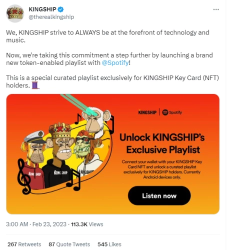 Theo một loạt các tweet của Kingship, một ban nhạc metaverse đã ký hợp đồng với Universal Music Group (UMG), công ty phát trực tuyến đang thử nghiệm các danh sách phát có thể được mở khóa thông qua NFT ở một số khu vực địa lý nhất định. Trong quá trình thử nghiệm, Kingship đã phát hành một danh sách phát đặc biệt mà chỉ những người nắm giữ NFT thẻ chìa khóa Kingship mới có thể truy cập được.