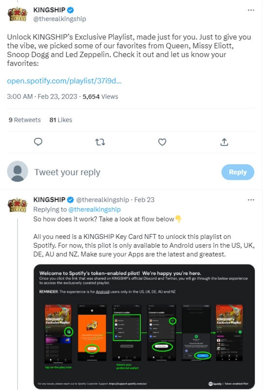 Nhóm đã đăng một loạt các bước liên quan đến việc liên kết ví tiền điện tử như Metamask, Trust Wallet, Rainbow, Ledger Live hoặc Zerion để xác thực NFT mở khóa danh sách phát. Kingship cho biết hiện tại, trải nghiệm này chỉ dành cho người dùng Android ở Mỹ, Anh, Đức, Úc và New Zealand.![]()