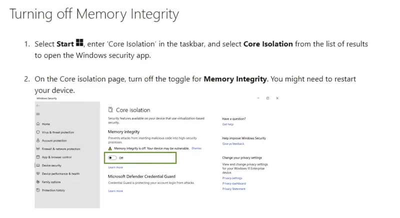 Microsoft tuyên bố đã nhận được phản hồi từ người dùng và nhận thấy rằng việc bật cả Tính toàn vẹn bộ nhớ và Nền tảng máy ảo có thể làm giảm hiệu suất. Do đó, Microsoft kết luận rằng các game thủ có thể 'tắt các tính năng này khi chơi trò chơi và bật lại khi chơi xong' nếu họ muốn trải nghiệm tối ưu trên máy của mình.