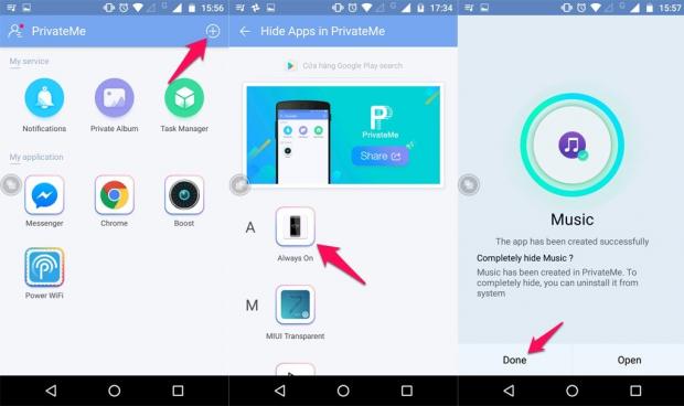 Tạo danh sách ứng dụng ẩn: Mở ứng dụng Hide App & Pictures > nhấn vào dấu '+' ở góc trên bên phải màn hình > chọn app cần ẩn và chờ quá thiết lập chế độ ẩn > nhấn Done để hoàn thành.