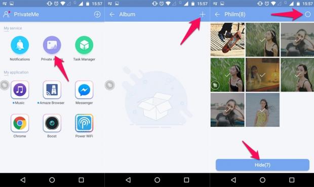 Ẩn album hoặc hình ảnh: Đôi khi có những bức hình hoặc video nhạy cảm, để chánh những điều không hay sảy ra tốt nhất bạn nên ẩn chúng đi. Thao tác thực hiện như sau: Tại giao diện chính, chọn Private Album > nhấn vào dấu '+' ở góc trên bên phải màn hình > chọn thư mục hoặc hình ảnh muốn ẩn > nhấn Hide là xong.