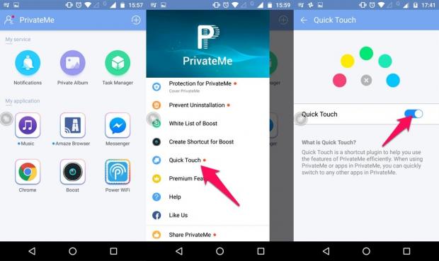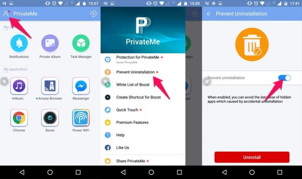 Kích hoạt tính năng chặn gỡ ứng dụng: Tại giao diện chính, nhấn vào biểu tượng hình người để mở menu > chọn Protection for PrivateMe và kích hoạt là xong.