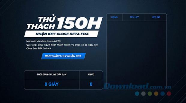 Người chơi cần online FIFA Online 3 liên tục đủ 150 giờ, bắt đầu từ 0h ngày 6/2/2018. Với 5000 người chơi đầu tiên vượt qua thử thách này sẽ nhận được key trải nghiệm của FIFA Online 4.
