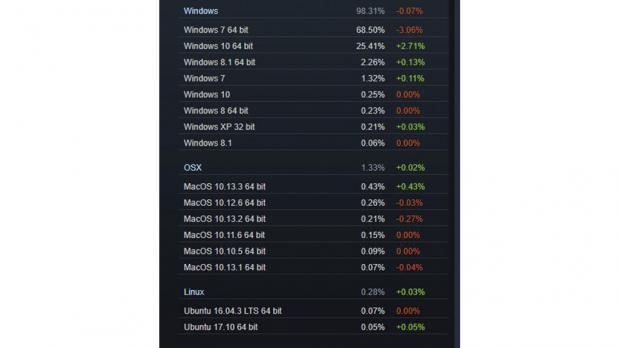 Nhìn chung, Windows vẫn chiếm ưu thế trong không gian chơi game với thị phần 98,31%. Tiếp theo là hệ điều hành của Apple - OS X tăng 0,02% lên 1,33%. Linux cũng chiếm thị phần từ 0.03% đến 0.28%, Ubuntu 17.10 64-bit và chiếm 0.05% thị phần.