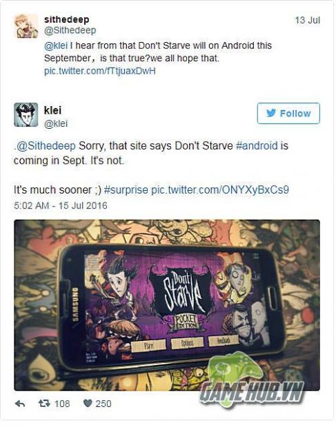 Klei đã dùng tài khoản Twitter của mình để đăng một tấm ảnh chụp game Don’t Starve qua điện thoại Samsung, tiết lộ: “Thật xin lỗi, trang web nói rằng Don’t Starve #android sẽ ra mắt vào tháng Chín nhưng không, chúng ta sẽ chào đón sản phẩm này sớm hơn #suprise”