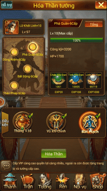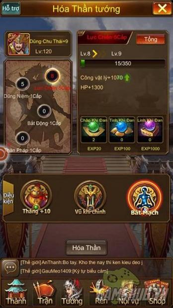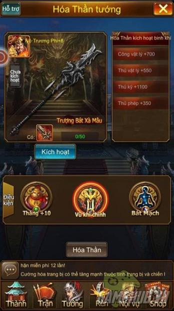 Tất nhiên, chặng đường nâng cấp thần tướng không hề đơn giản. Đầu tiên sẽ phải nâng tướng lên cấp 10, kích duyên bảo vật riêng cho từng tướng, và cuối cùng là thăng cấp tối đa cho Bát Mạch. Gian nan là thế, nhưng chắc chắn, việc sở hữu trong tay một Chiến tướng hoá thần sẽ là niềm kiêu hãnh của người chơi.