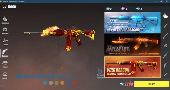 Firearms sẽ trang trí cho bạn skin tuyệt đẹp lên những vũ khí mà bạn thu thập được, có những loại skin đơn giản chỉ được sơn màu lên súng, loại cao cấp hơn sẽ có những hiệu ứng đẹp mắt vây quanh thân súng. Giá của những loại skin này đa số phải mua bằng kim cương.