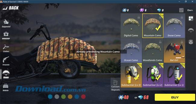 Mục này cũng sẽ giới thiệu cho bạn những skin vũ khí và trang phục, quần áo bên ngoài, màu dù và màu của phương tiện trong game.