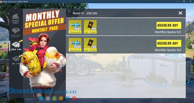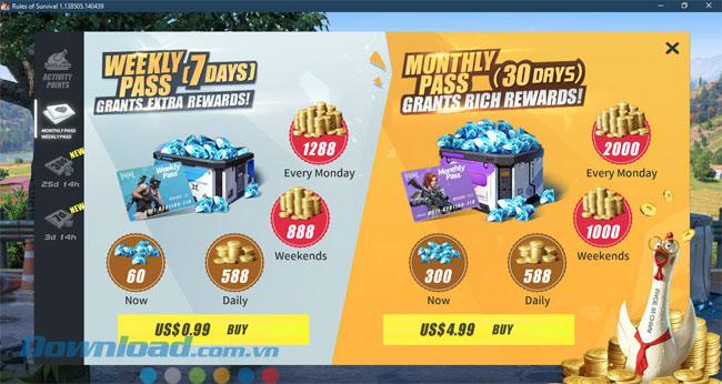 Ở dưới là cửa sổ Monthly Pass và Weekly Pass, là những gói ưu đãi nhận thưởng theo ngày mà bạn có thể mua bằng tiền mặt, những mốc nhận thưởng là ngay sau khi mua, mỗi ngày, cuối tuần, thứ 2 mỗi tuần.